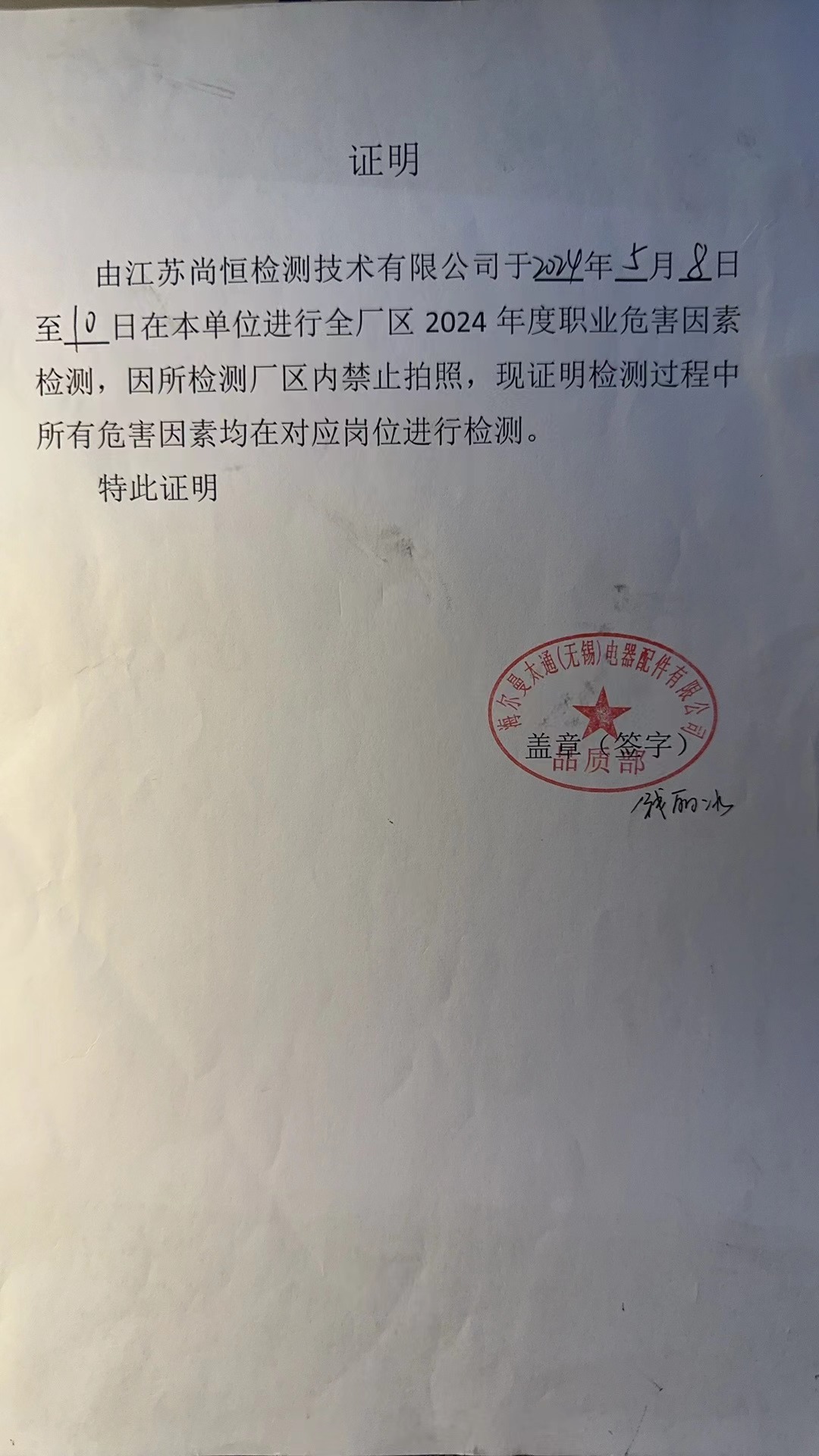 用人單位名稱 無(wú)錫市電盟科技有限公司 用人單位注冊(cè)地址 無(wú)錫市錫山區(qū)羊尖鎮(zhèn)厚新路268號(hào) 聯(lián)系人 鄭為國(guó) 報(bào)告名稱及編號(hào) 職業(yè)病危害因素檢測(cè)報(bào)告 Z20251172 項(xiàng)目組人員 耿朔辰、方佐、華佳鋮、趙婕 現(xiàn)場(chǎng)調(diào)查人員 耿朔辰、方佐 現(xiàn)場(chǎng)調(diào)查時(shí)間 2025年11月25日 用人單位陪同人 鄭為國(guó) 采樣與測(cè)量人員 華佳鋮、趙婕 采樣與測(cè)量時(shí)間 2025年11月28日 用人單位陪同人 鄭為國(guó) 現(xiàn)場(chǎng)照片(現(xiàn)場(chǎng)調(diào)查及現(xiàn)場(chǎng)采樣與測(cè)量照片,含企業(yè)名稱或標(biāo)識(shí)的合影照片) ? ? ? ? ?...